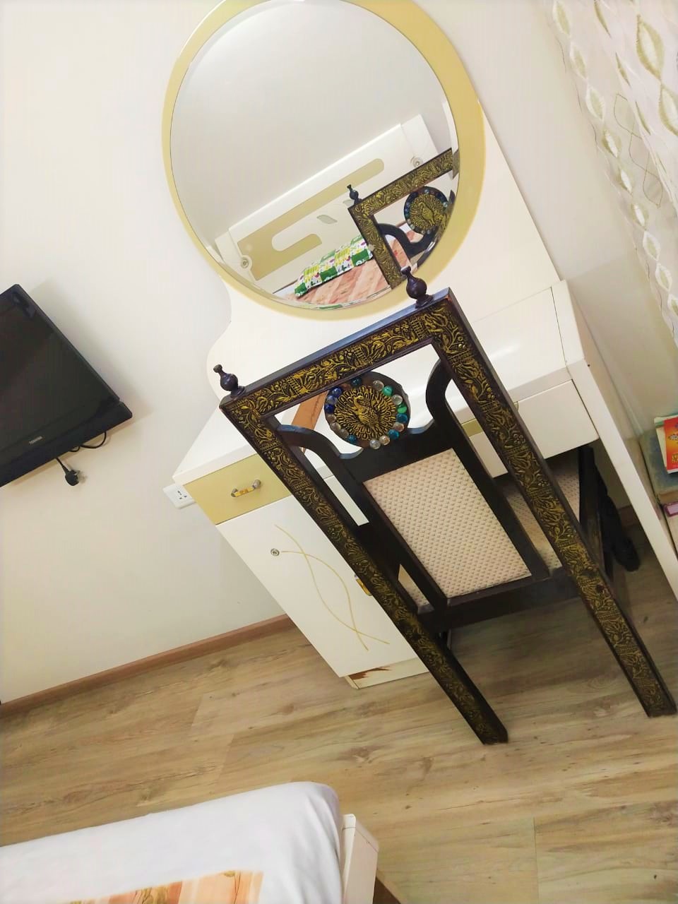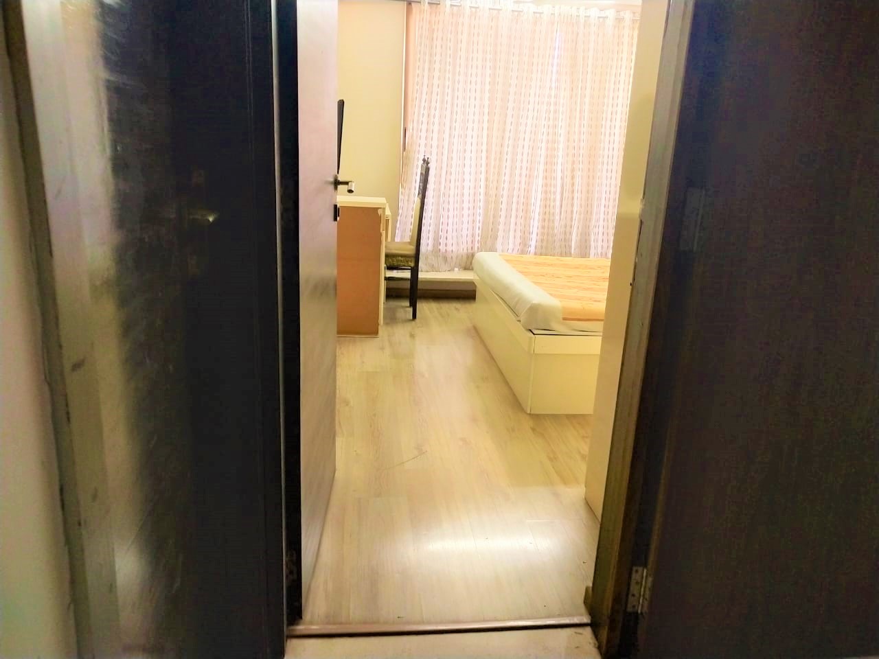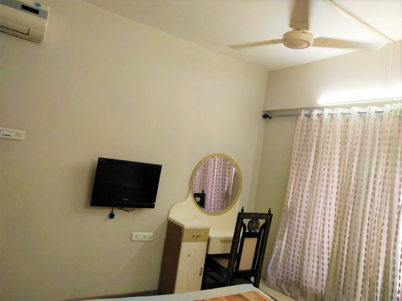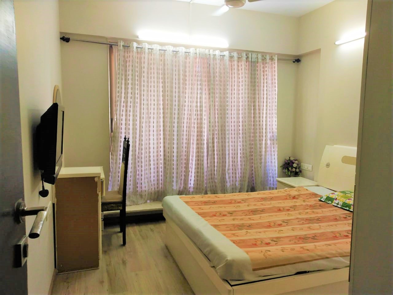 It is a fully furnished room with a TV, Table, Chair and a bed. Bathroom is shared with one other person.